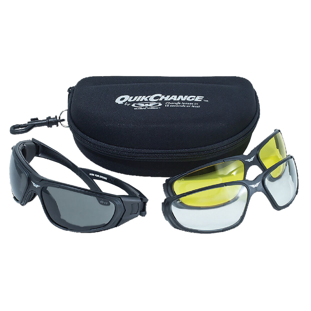 Set sa izmenjivim sočivima u prozirnoj, obojenoj i žutoj boji: Naočare se mogu nositi sa držačima za uši ili priloženom podesivom trakom. Uključuje mikrofiber krpu za čišćenje, futrolu sa sunđerastim pregradama za izmenjiva sočiva.